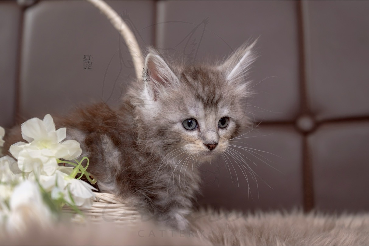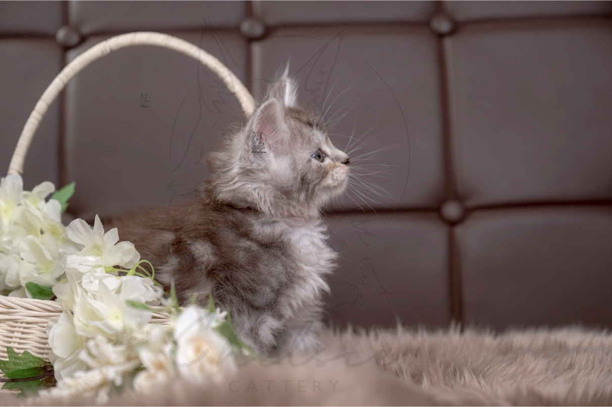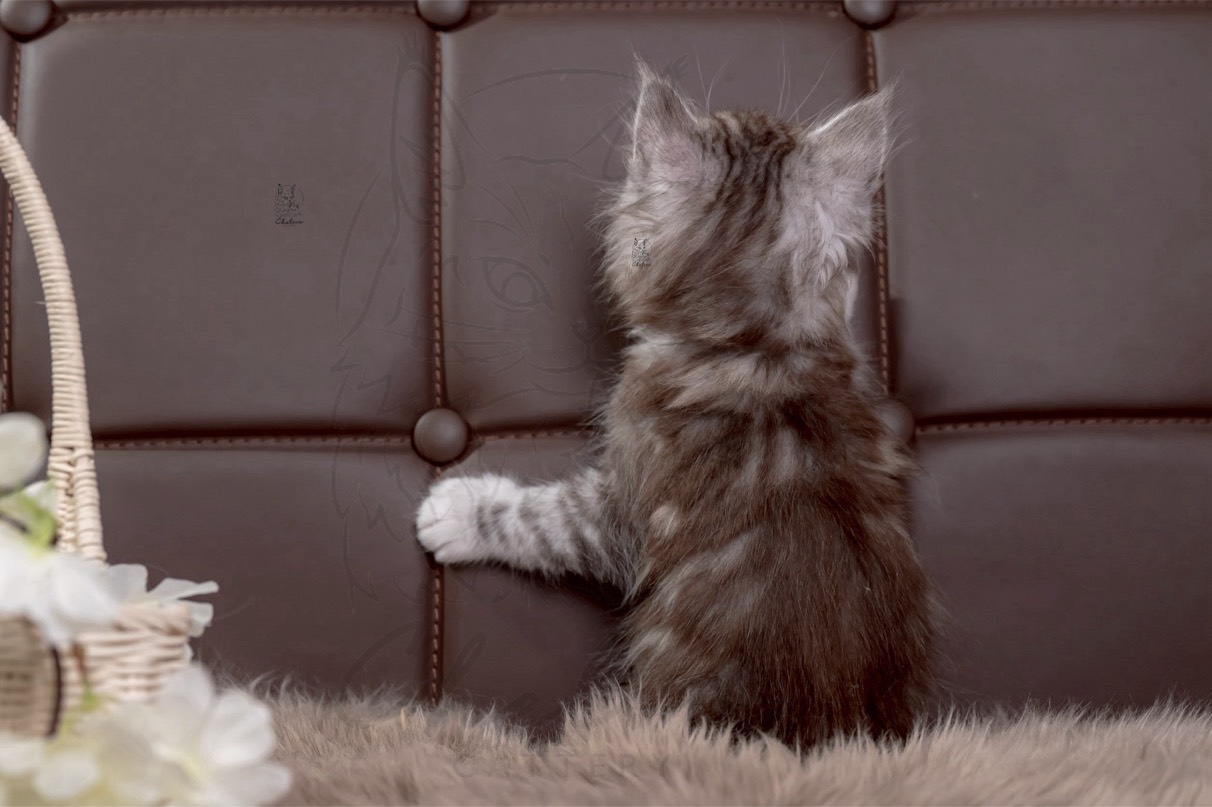 Camila是一隻黑銀虎斑帶白的緬因小女生,她的毛色有著清晰的黑銀條紋,搭配著白色的小肚肚和腳掌,看起來特別精緻可愛。雖然她還小,但舉手投足間已經散發出一股特有的小氣勢。