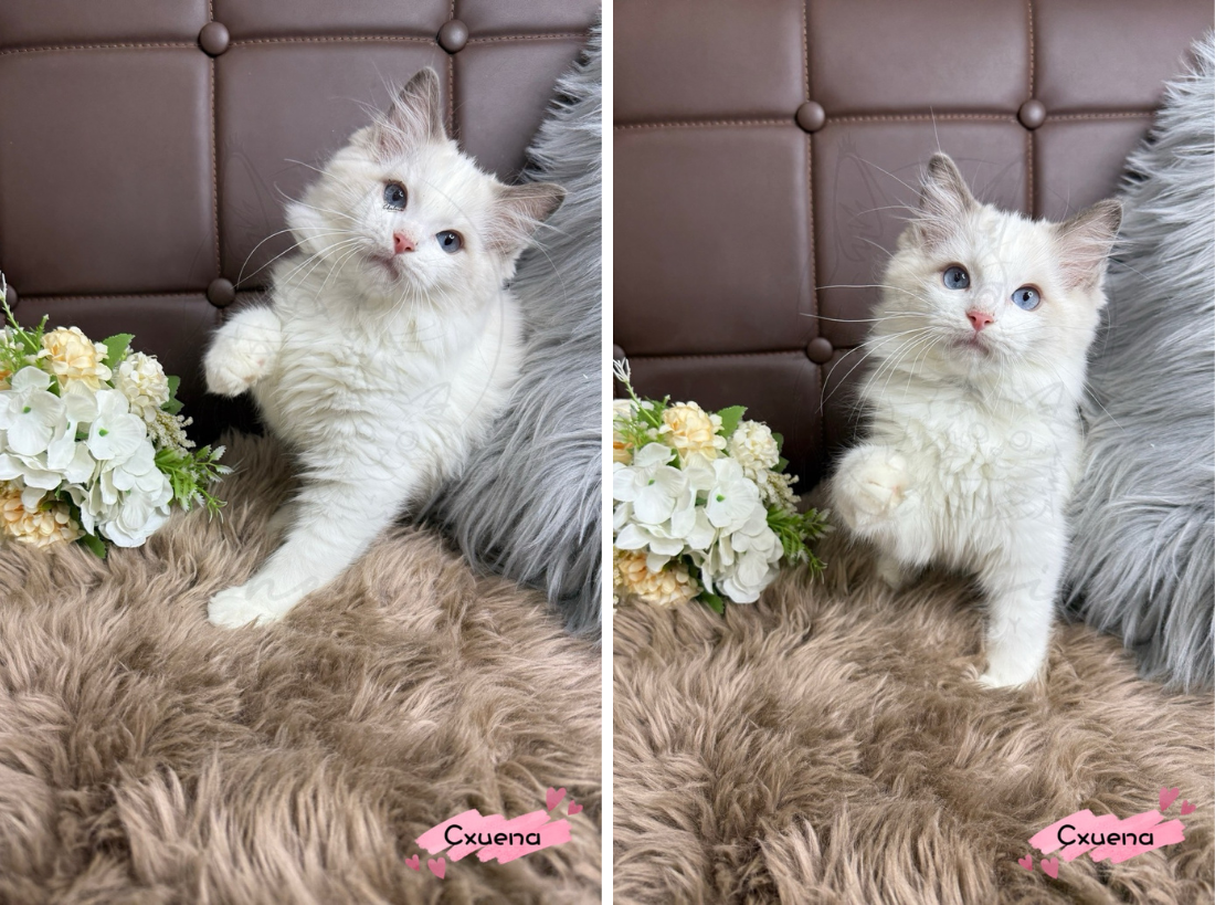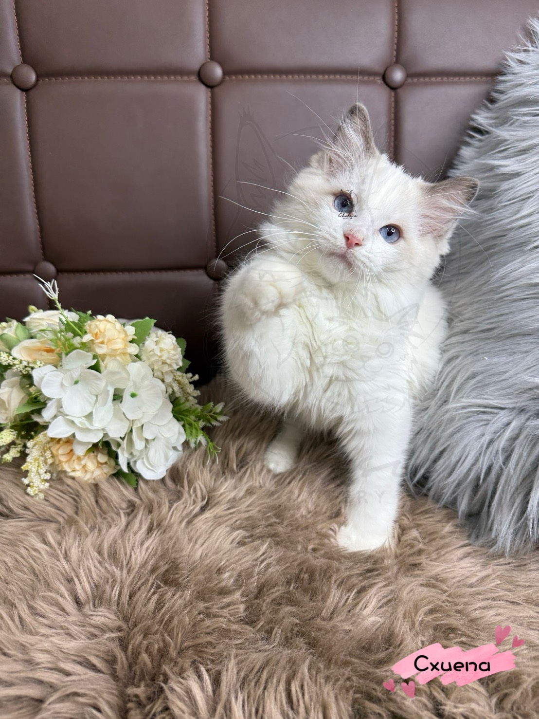 Cxuena是一隻藍雙布偶小男生,他的毛色柔和淡雅,臉上的花紋就像被畫上去的一樣對稱精緻。雖然他還小小一隻,但已經散發著安靜的氣質。