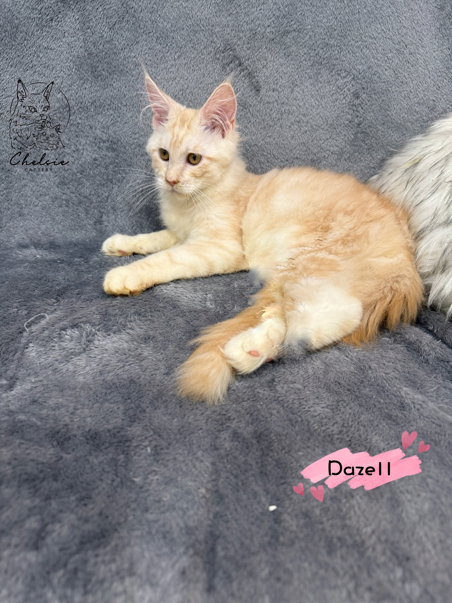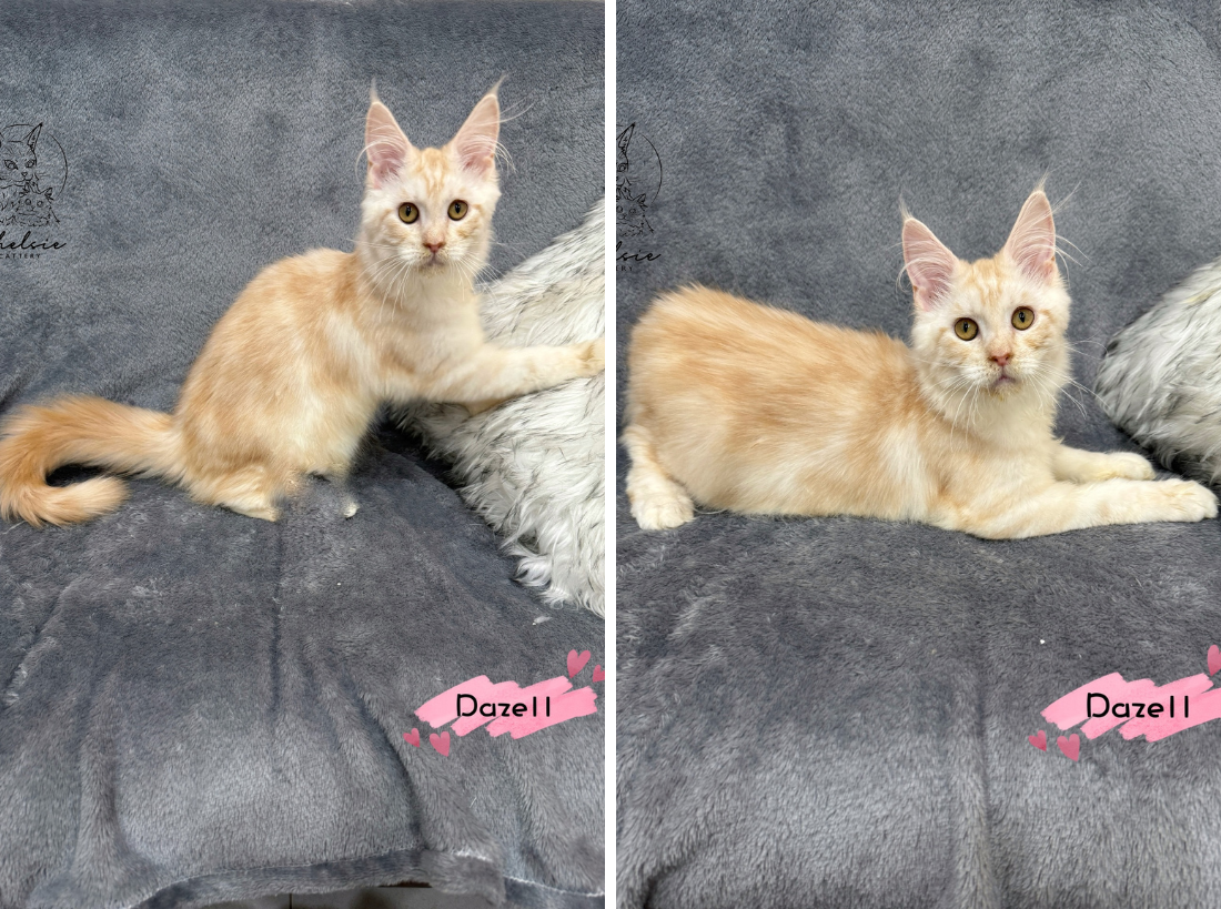 Dazell 是隻紅銀虎斑的緬因小男生,毛色明亮柔和,虎斑紋清晰自然,看起來像一隻溫暖的小太陽。