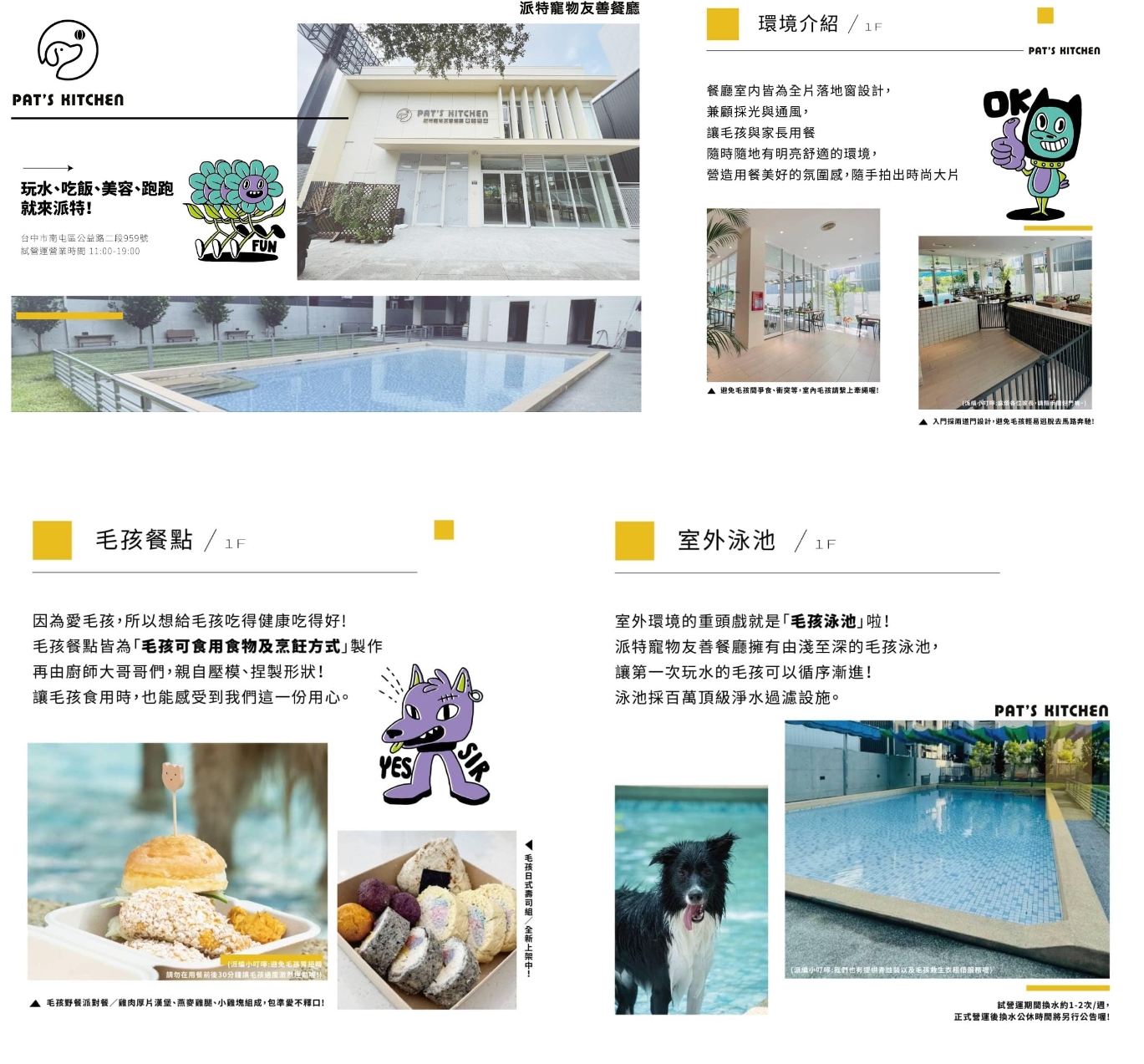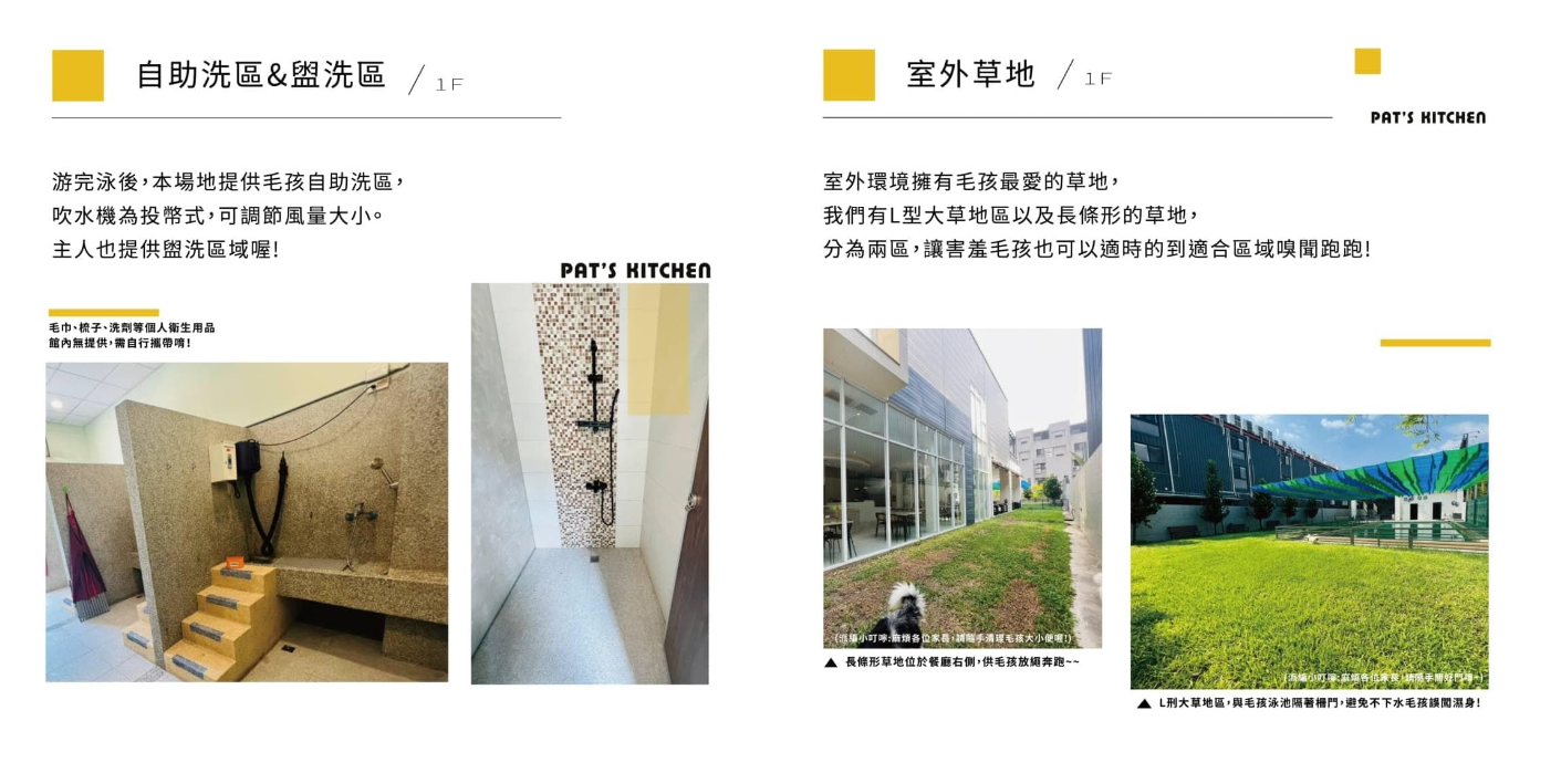 位於台中市南屯區公益路上的「派特寵物友善餐廳」,兩層樓的空間建坪約400坪,除人狗共處的寵物餐廳外,還有大型戶外游泳池、戶外遊憩區,還有寵物美容服務、犬貓分區的寵物旅館,以及毛孩幼兒園安親班。