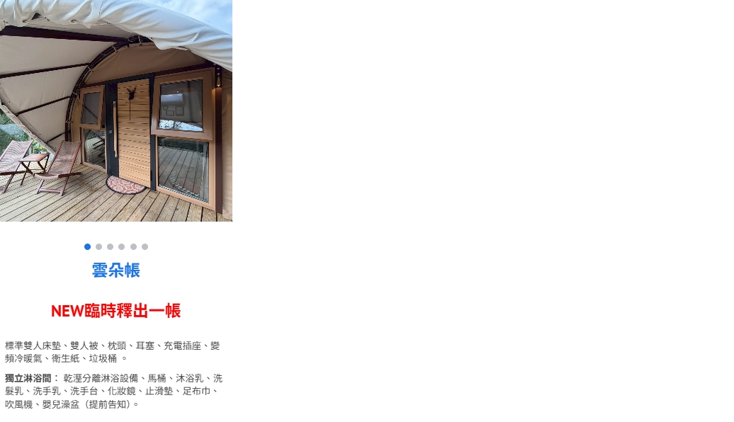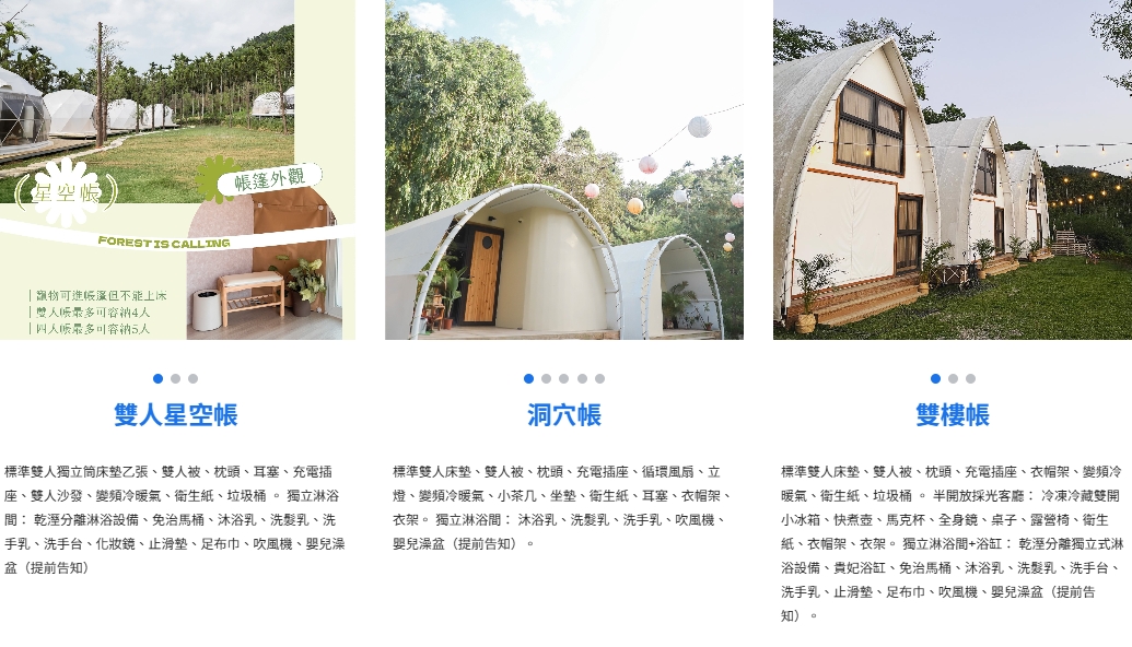 洞穴帳(1帳)、星空帳(4帳)、雙樓帳(2帳)、NEW臨時釋出:雲朵帳(1帳)