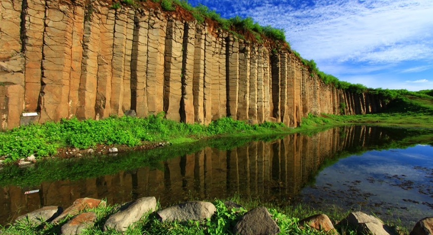 這片大菓葉玄武岩因為整片山壁都是這種柱狀節理,而且高度夠高,形成非常特殊的景觀,而且每逢大雨過後,玄武岩前方的凹地正好盛接了雨水,整塊高聳的岩壁倒映在水面上,形成非常獨特又令人驚奇的畫面,常常吸引許多人前來拍照,是西嶼鄉特殊的自然景觀之一。