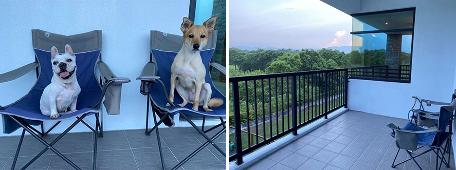 戶外陽台區很舒服,晚上可在這喝著啤酒聊著天,早上叫屁孩起床看風景,結果香奈兒出現了冏臉。