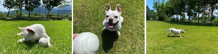Coco咬著球奔馳在大草皮上,法鬥的臉不管怎麼看都覺得可愛。