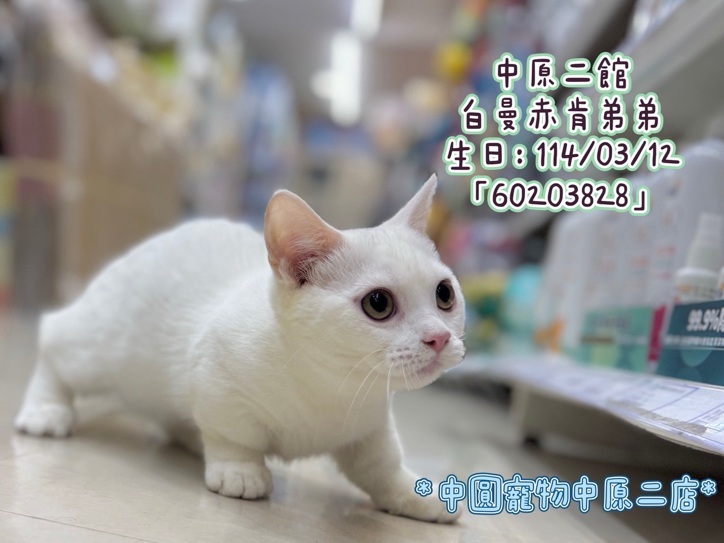 中圓寵物家族/白色曼赤肯 Post published:2025 年 8 月 7 日 Post category:品種幼貓 / 中圓寵物家族 / 嚴選寵物店 / 曼赤肯 品種:白色曼赤肯 生日:114/03/12 性別:弟弟 所屬分店:中壢中原二館│特寵業字第C1070262號當店地址:桃園市中壢區中山東路二段16號加入LINE看更多寶貝│洽詢專員https://rink.cc/69x7p 🉑預約現場和毛寶貝互動