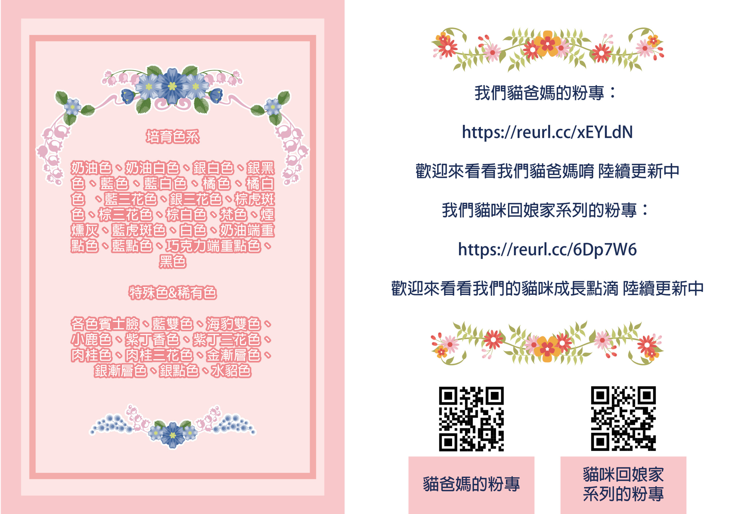 專業培育品種:曼赤肯短腿貓 小步舞曲短腿貓 美國短毛貓 英國短毛貓 英國長毛貓 布偶貓