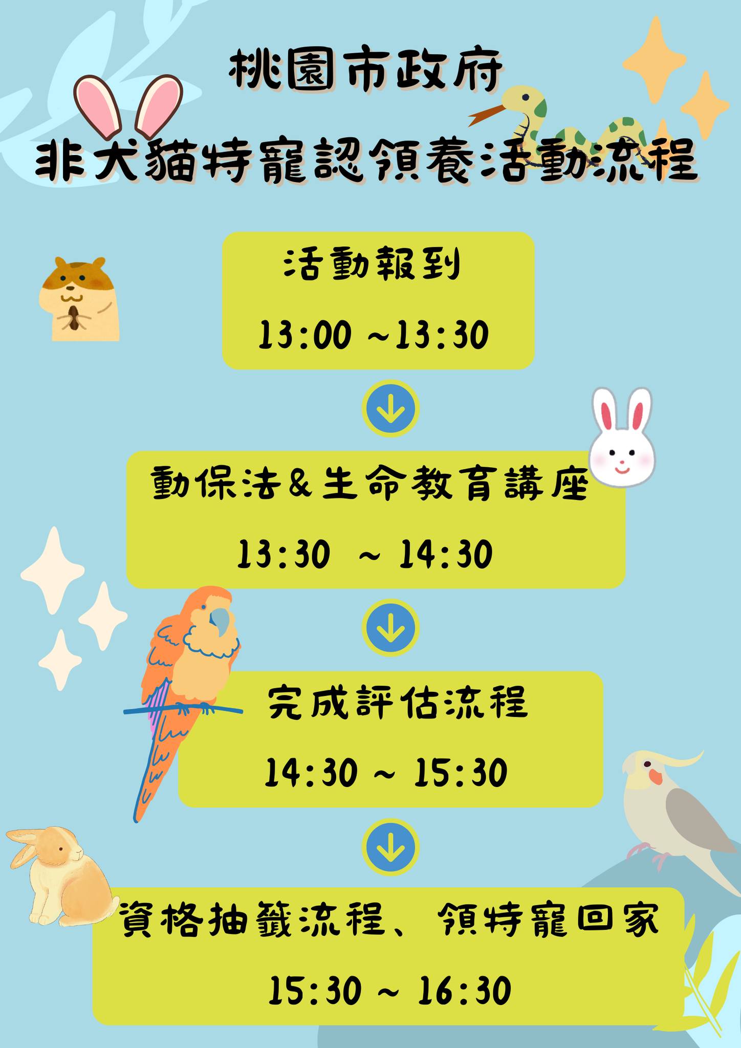 動物保護處提醒,認養民眾應有飼養非犬貓特殊寵物之心理認知,須參加1小時動物保護及生命教育課程-【認養前的三思】,了解如何飼養、照護特殊動物,如飼料、飲水,環境、衛生管理及異常狀況注意事項,以及現行《動物保護法》法規等,更多活動詳情請參考桃園市政府動保處官網https://animal.tycg.gov.tw/專頁。